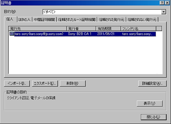 (4) | インストールした証明書をダブルクリックするか、表示ボタンを押すと、証明書の詳細が表示されます。