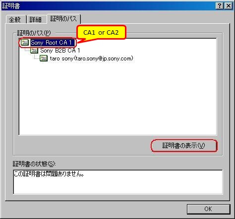 (5) | [[証明のパス] タブを選択し、最上部のRoot CA証明書[Sony Root CA 1] または、