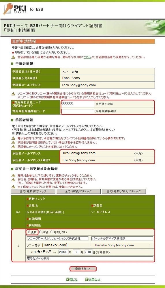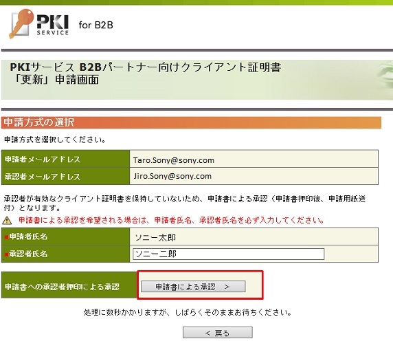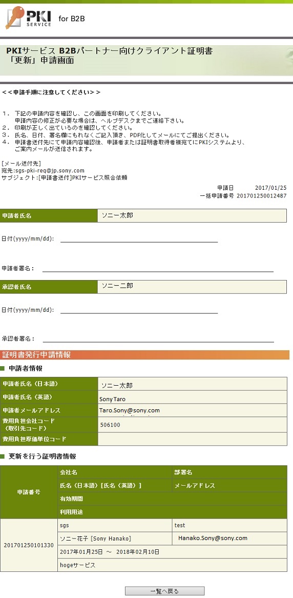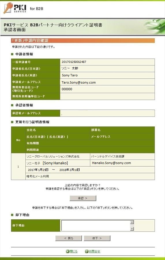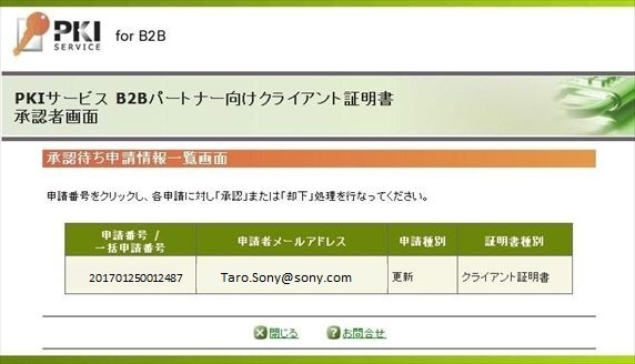 承認待ち申請情報一覧画面では、承認者に対する承認待ちの申請が、申請種別 / 証明書種別問わず全て表示されますので、お間違えのないようご注意ください。